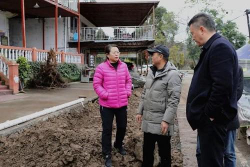 宋莉(中)現(xiàn)場(chǎng)查看截污干管建設(shè)和沿線商戶原有設(shè)施恢復(fù)情況